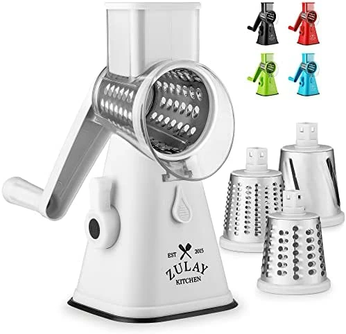 - Protects Your Hands: Features 3 food grade stainless steel drum blades with unique patterns; interchangeable for fine grating, coarse grating, and vegetable slicing. Designed to keep your hands away from touching the sharp blades when grating.